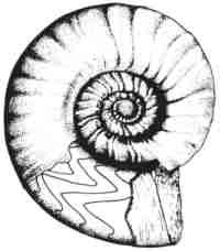 El cuadro muestra a un Goniatites típico con una línea de sutura muy simple. La línea de sutura es la línea, que forma la pared de división de las cámaras. Con el correr de la evolución esta cambia repetidas veces.